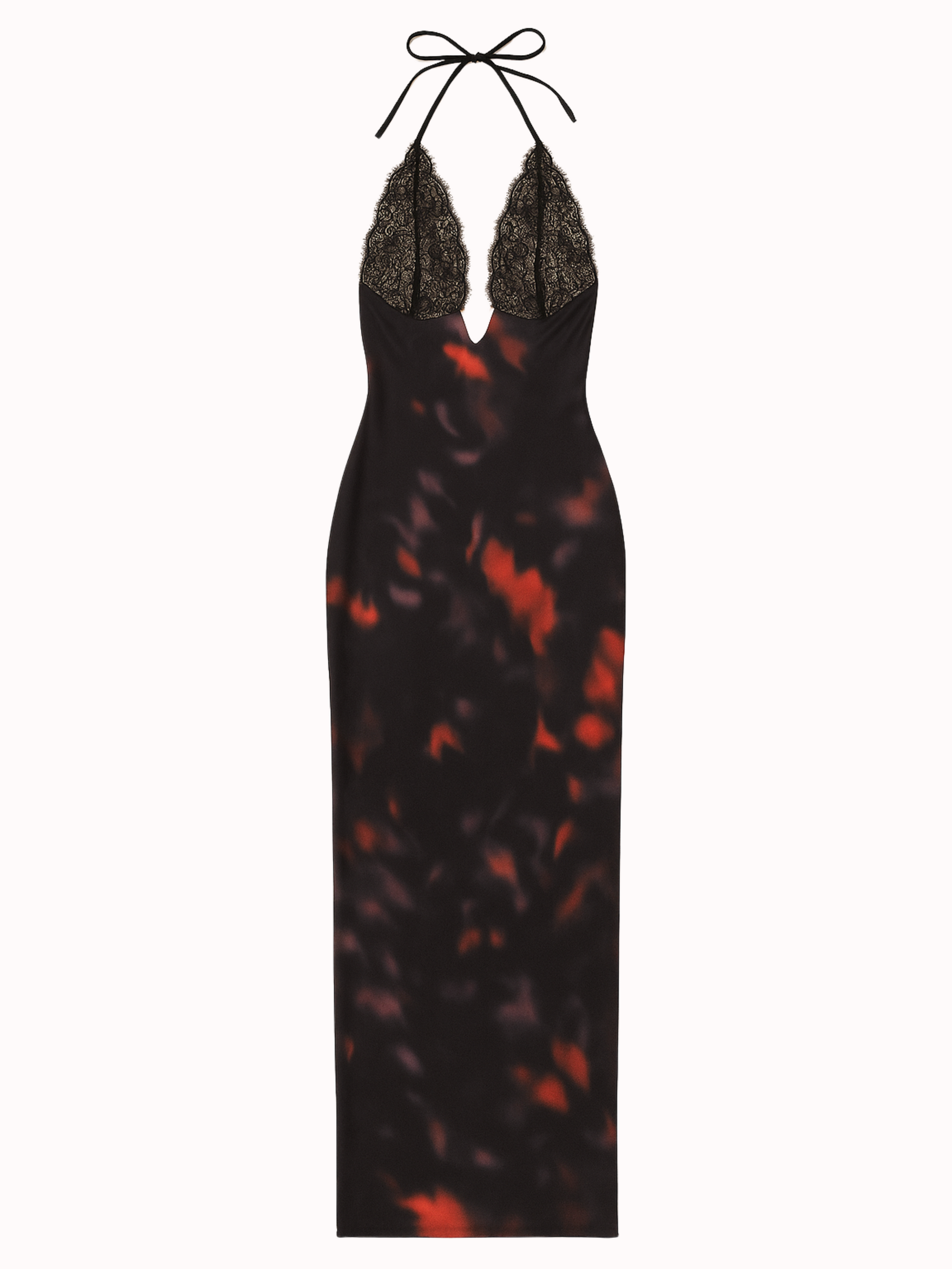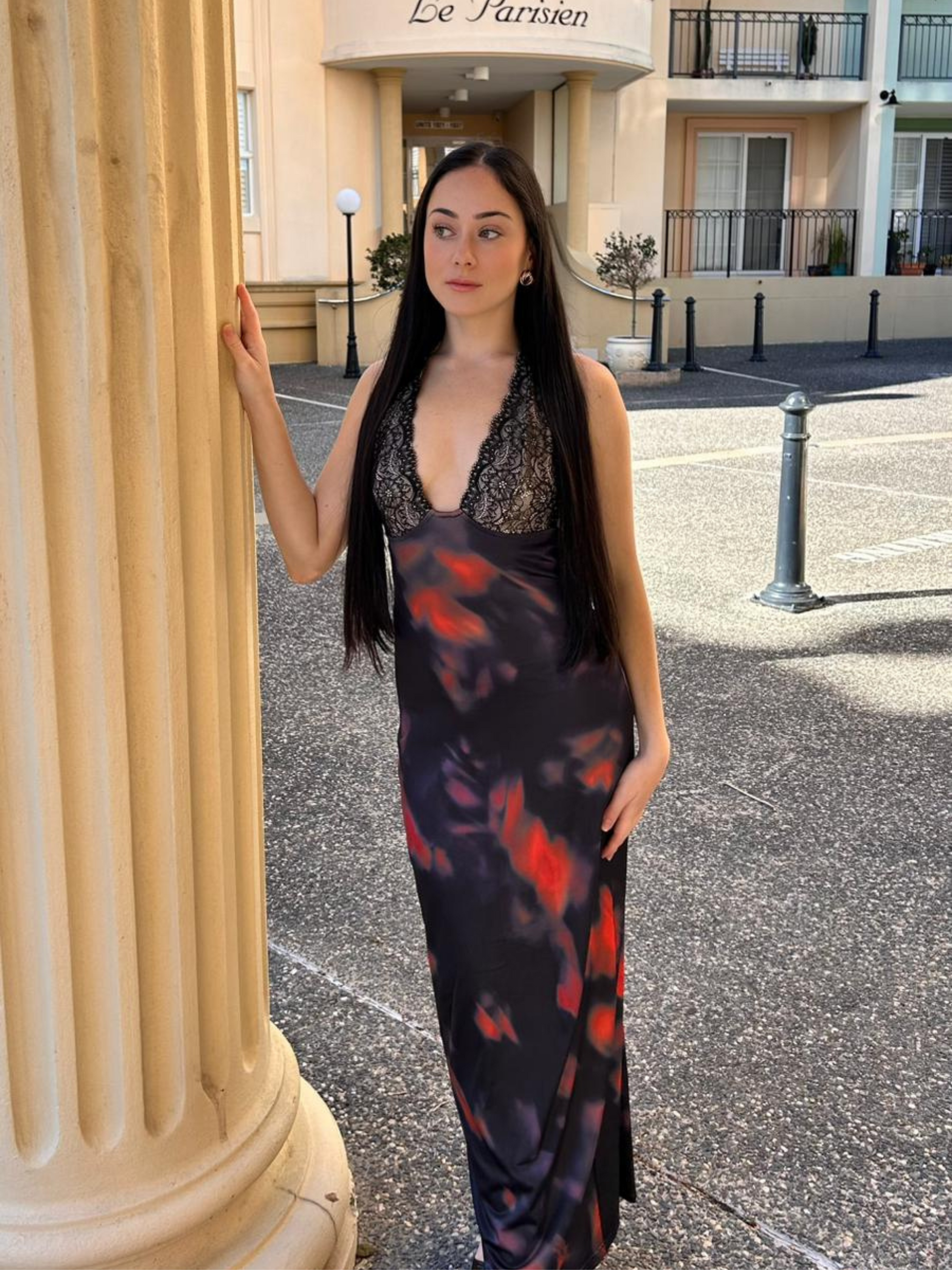 The Lara Maxi in Black is a striking blend of elegance and allure. Featuring a body-hugging silhouette with soft floral print and delicate lace bust detailing, this dress is designed to sculpt and flatter in all the right places. With its plunging neckline and floor-length hem, Lara makes a bold statement from sunset dinners to late-night soirees.