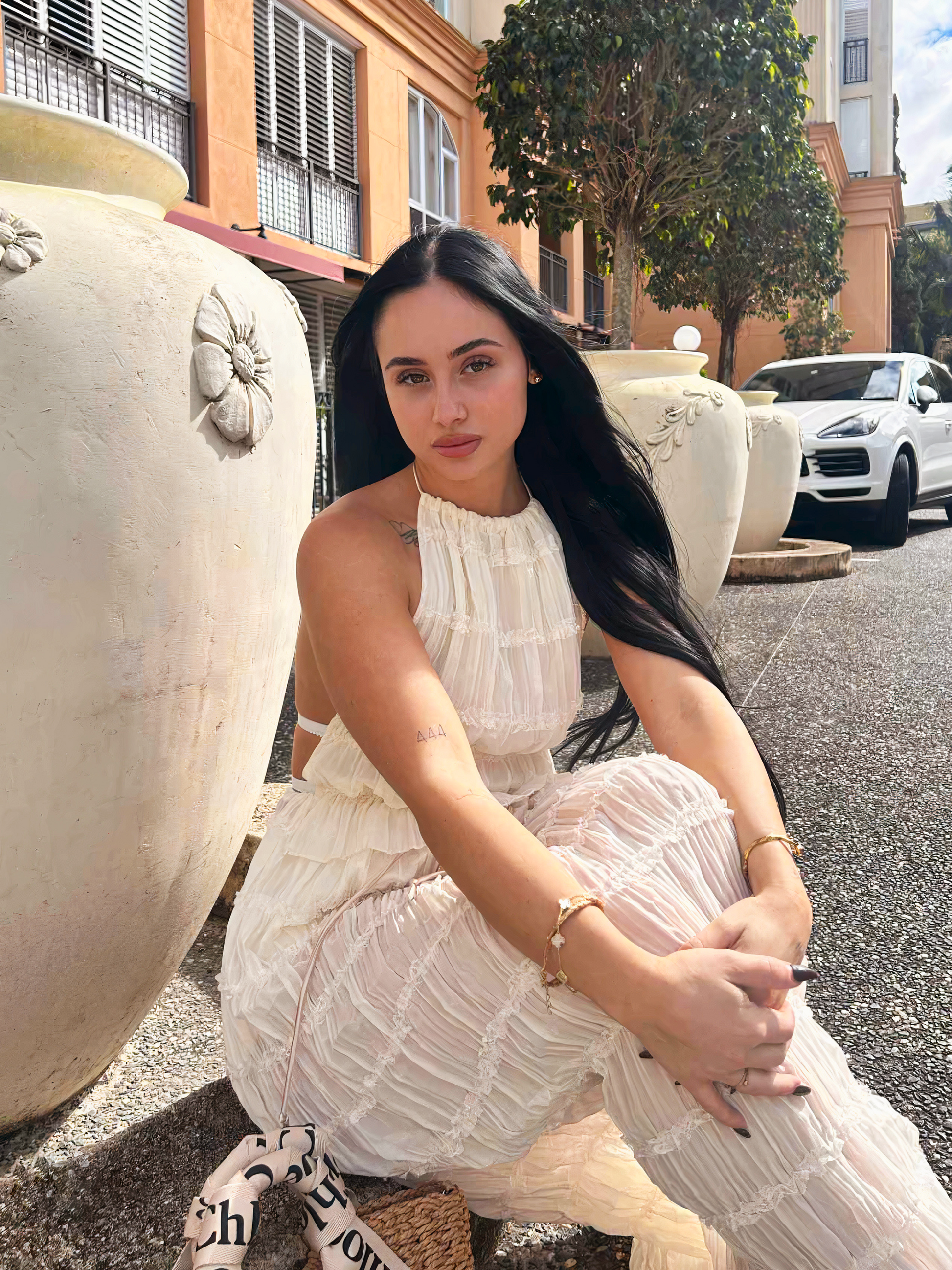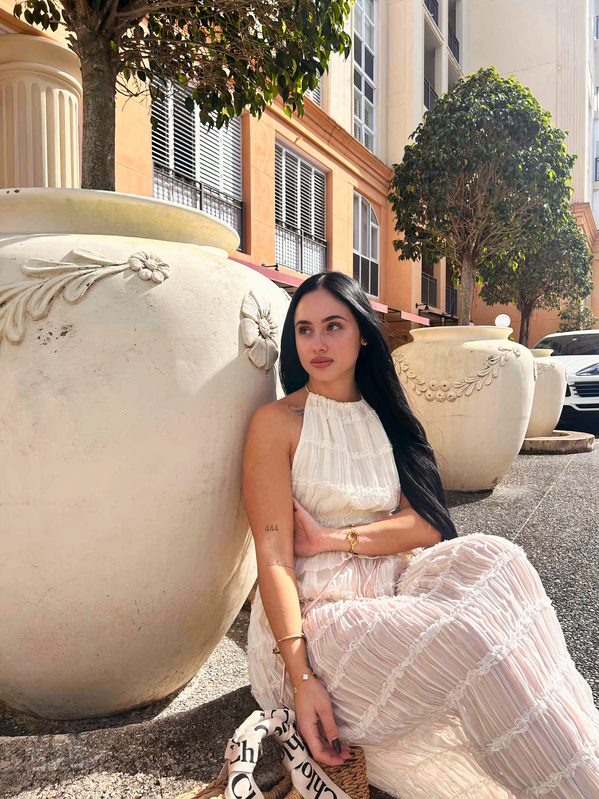 Style with oversized sunglasses, espadrilles, and dainty gold accents. A loosely braided updo and woven tote complete the look.