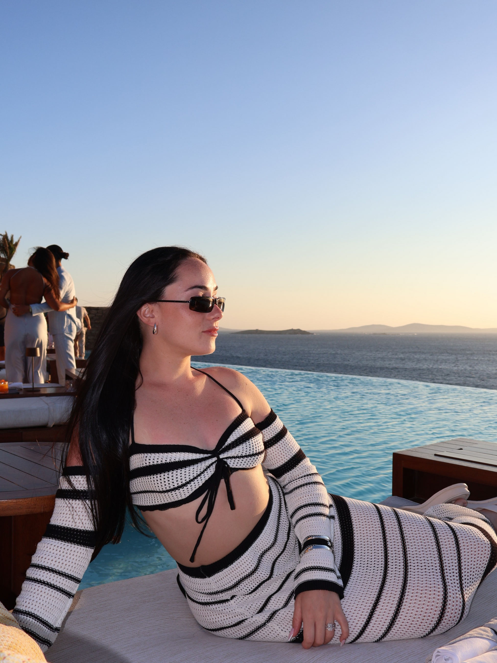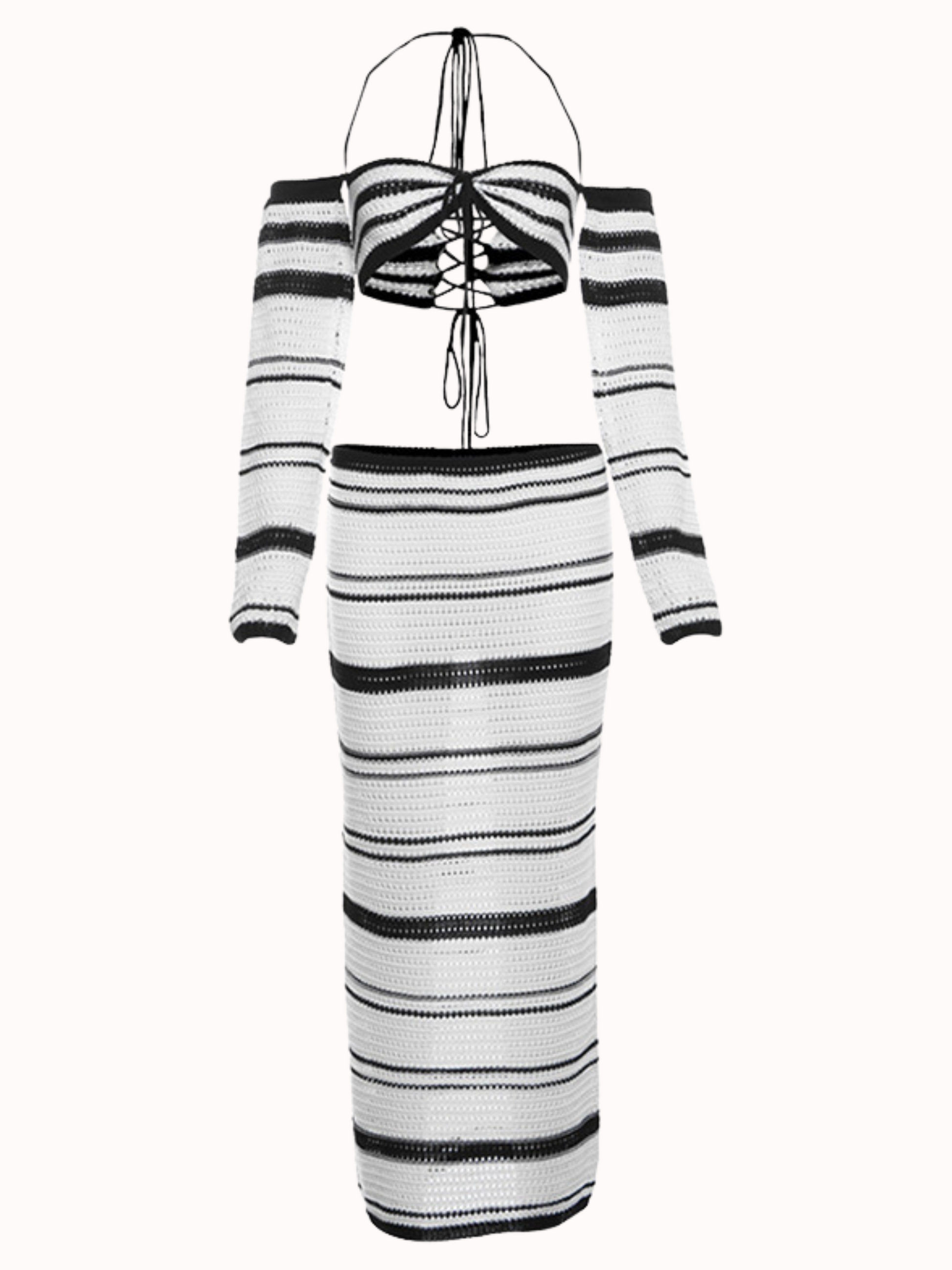 The Zena Mesh Two Set is a modern, coastal-inspired ensemble that balances effortless femininity with bold confidence. Featuring a flattering bandeau-style crop top with delicate tie detailing and off-shoulder long sleeves, it pairs perfectly with a matching high-waisted, ankle-grazing skirt. The soft knit hugs your figure while the monochrome stripe pattern adds a timeless edge. Whether styled together or separately, Zena is made to turn heads from golden hour to moonlight.